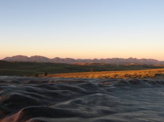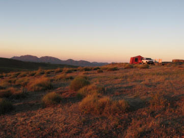 Sun setting over Wilpena Pound and our camp at dawn at Stokes lookout.