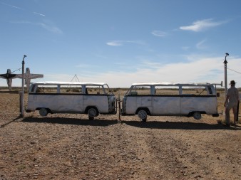 The track is wide and well maintained but has a great feeling about it as there is just nothing in every direction. I just love that sparseness where you feel you could be on another planet. Then out of the blue you come across a very strange sight indeed. It is a sculpture park where the gates to it are a Kombi VW cut in half!