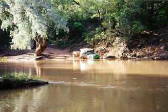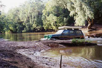 Just before getting there on the Telegraph track we met a small group of 4wd's for the first time and stopped them to check how the river was up ahead. It turned out that they had been camped for 5 days on the opposite bank waiting for the river to drop. They ended up getting a large 4wd truck from this side and borrowing some very long cable to stretch over the 60 meter wide river from the homestead and swimming across with it to the other side where they then towed the whole group one by one across the river without the their motors running. They showed me their soaking wet seats they were sitting in and thought we would be mad to try it on our own and should turn around. Well seeing as we had come this far we pushed on to at least to look at the crossing. We got there just on dusk and my wife was not keen on swimming across this one so I stripped off and started walking to the other side. It was up to my chest and I could not stand up for long before being swept downstream. If you cant walk across without this happening then you can't drive across as it means it is too deep or flowing too fast. When I got to the other side I read a sign saying BEWARE OF SALTWATER CROCODILES! Great I thought and still had to swim back by what was by now moon light. Well I marked the bank at the water level to see if it was coming up or down and camped up on the bank for the night. We woke up in the middle of the night to the sound of an engine and jumped out of bed to see a Landcruiser Ute driving down the opposite bank and straight into the water. In no time the headlights were underwater but they just kept on going with the water now up to the windscreen. They missed the exit up the other side because they couldn't see but just gunned the thing even harder to get up the bank. I was amazed that they made it but with a snorkel and a diesel they had a better chance then most. Once on the bank they simply just opened the doors to let the water out without stopping and just kept going! It turned out they were Aboriginals that had stolen the Rangers truck and were heading to Weipa for more beer!