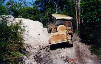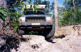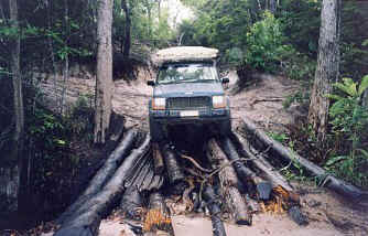 One of the banks looked so steep that I got out the winch as I was sure I wasn't going to get up but prepared it with collecting logs and branches to put at the bottom of the vertical climb and cutting the top of the bank off with a shovel and throwing this over the logs. The only problem was that when collecting the wood I was bitten by a poisonous Whip snake that lashed out at my foot and I only had reefs on at the time. I could see a mark on my big toe and unsure if the venom had gone in started to worry how to get out of there as we were nowhere near anything or anyone. I started to break out into a sweat but couldn't turn the car around and still had the high bank to climb to go forward. You are supposed to sit still and strap the limb but it was not an option as the rain had started to come down again and I knew the rivers would come up higher stranding us between them. Working quickly we finished preparing the bank and I took a charge at it and amazed myself by getting up it.