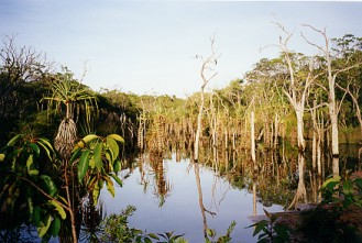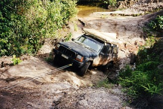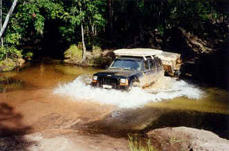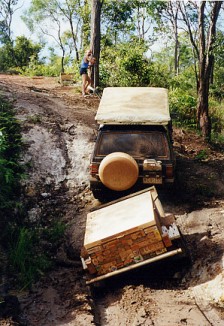 Running it through a snatch block to halve the effort but double the time taken, I slowly winched the car and trailer out until I could drive it up the rest of the way and took a good soak in the creek as the sun had come out and was now a steamy mid 30*C day. Fortunately it had not rained as far south as the Wenlock river so it was a little easier to cross than on the way up. Decided to take a 'short cut' on a little used track to get across to the Weipa road and camped by the side of it that night. In the morning decided to re-pack the whole car and dry a few things out only to get a flat battery from having the doors open! Now what were we going to do as it was 40*C or 100*F and we were on our own. I remembered passing a homestead the day before so filled the rucksack with as much water as I could carry and spent half a day hiking back on my own to it hoping someone would be there. As luck had it they were about to leave for 2 weeks to check the fencing ( we have stations over a million acres here ) so they agreed to give me a lift back and jump start the Jeep so I gave him plenty of beer money for his trouble.