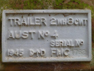 Though similar in dimension to the Willys trailer used in the USA, these Australian ones had different stampings on the ends, guards, and other details. Notice the Willys or Bantam trailer behind it to compare. Here is my tag. 2WH means 2 wheels. 8 CWT is 8 Hundred Weight, ( 8x112 = 896 lbs), just over 400 kg. Made in 1945. FMC shows it was made by the Ford Manufacturing Company in Geelong. They were also made by GMH in Adelaide. More information of them here. http://jeepdraw.com/TRAILER-AUSSIE.html