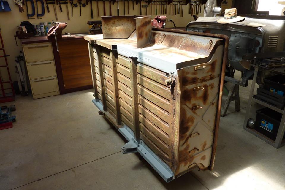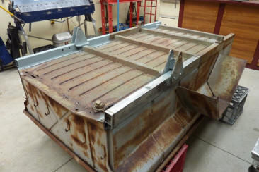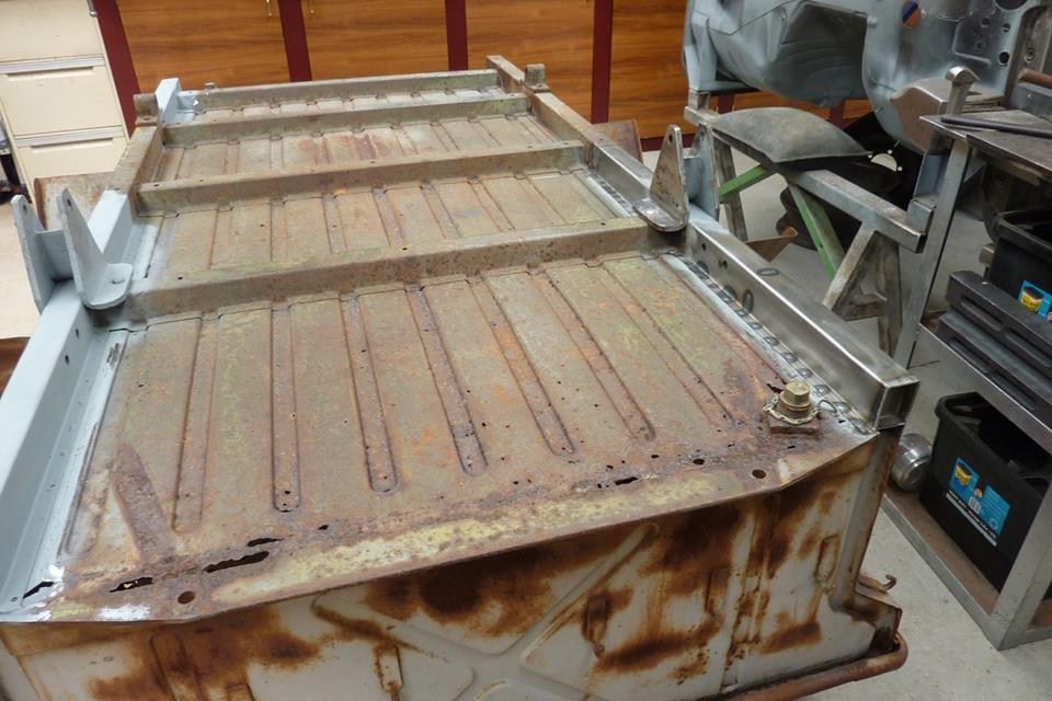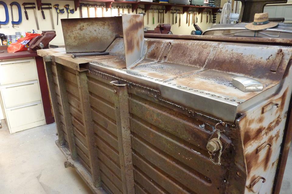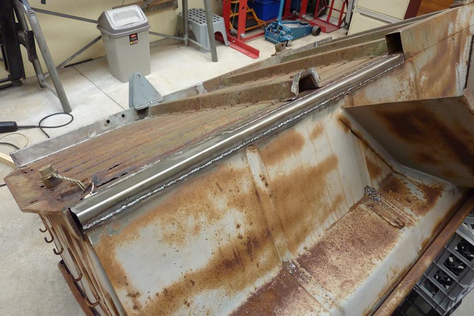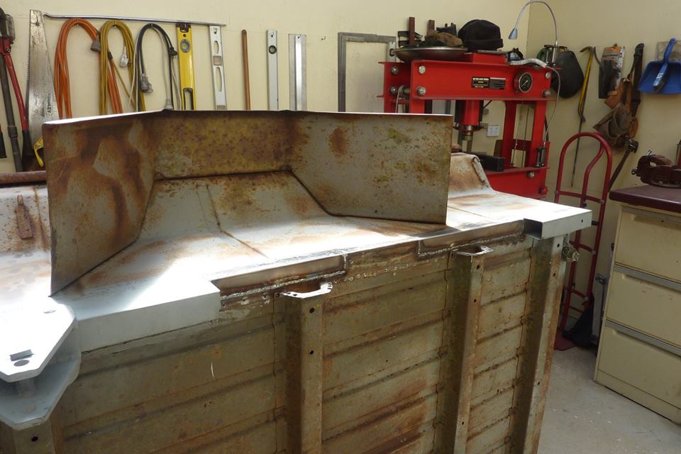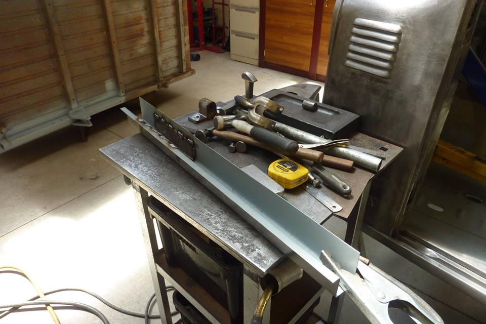 I built a special dolly on the end of a piece of pipe so I could planish out the welds to stretch the weld shrink out. Zinc coated before the rail goes in place.