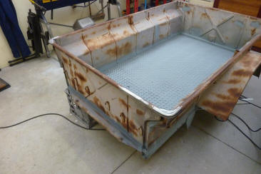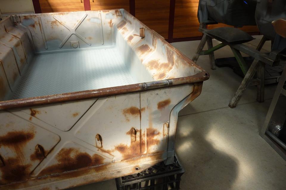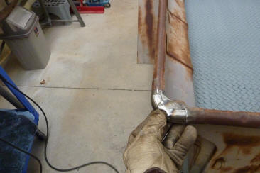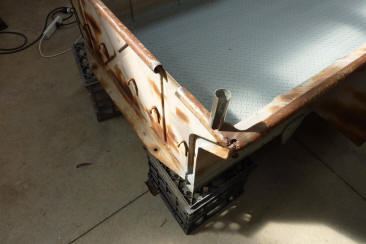 Finished off. The two front corners next. Also notice I cleaned up the joint at the bottom of the front panel where the angle iron is welded on. Most of the area behind it was replace when I repaired it from the inside but the little section near the top I sprayed Ranex rust converter into the joint and let it soak. It is just phosphoric acid. Used this on the joints between the mud guard and the sides too and other places. I looked to see if I had any bent tubing to suit the corners and took this from the front of my wheel burrow! Otherwise I would have made a wooden form and hammered some metal over that.