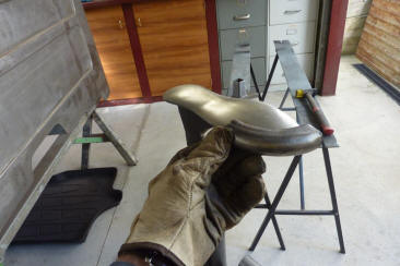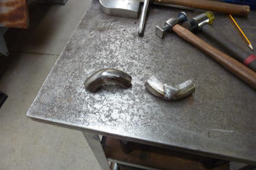 Cut two sections from it and cut part the the inner curve out. Then started to flattened the top to suit. Tightened the radius in my shrinker but still need it a bit tighter in the middle. So a wedge cut and then pulled tighter before welding it up again fixed that.
