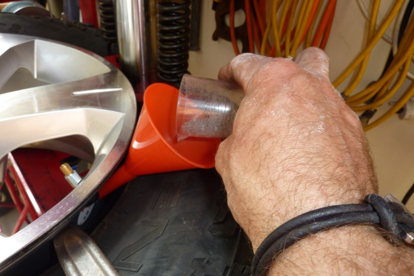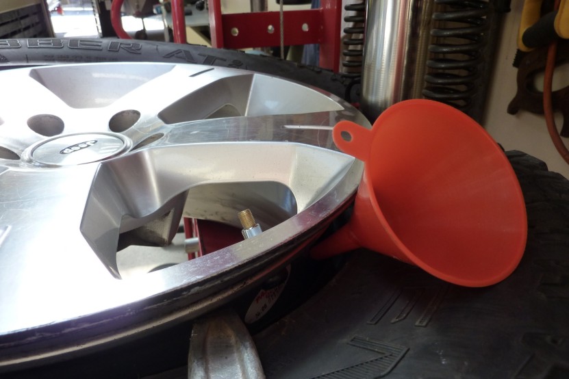They provide a funnel to help add the beads to the tyre. Just make sure you have none left between the tyre bead and the rim as will cause a leak when reinflating. As not all the upper bead was broken doing this, it was easy to reset the bead just inflating the tyre while the valve core was still out of the stem to get greater flow. On the trailer tyres, which are narrower and still on the same width rim, I had to place the tyre on a few blocks and then stand on the rim to help seal the bead before inflating.