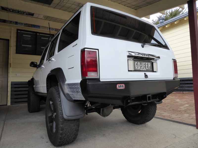 Custom rear bar made from a 80 series front bullbar. NOS Wagoneer taillights and chrome trim above the number plate imported from the USA. LED reverse lamps and number plate lights. Propeller plate corner guards.