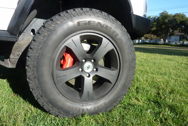 13.5" Ford Territory Turbo with 4 piston Jeep/Chrysler SRT Brembo calipers. Plasti Dip coated wheels with can be peeled off and returned to the polished alloy finish underneath.