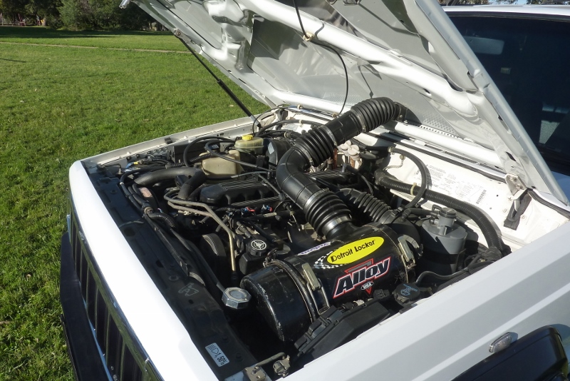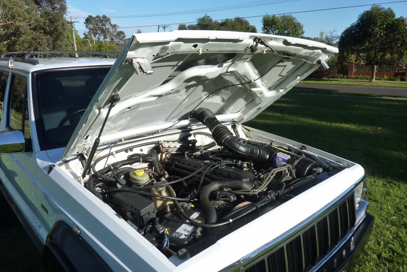 Taurus 2 speed selectable fan conversion with manual over ride. Stock electric fan still fitted with copper and brass Adrad radiator. No cooling issues at all. Custom battery tray to fit larger battery. MF80D26R with 720 CCR and 130RC. A 132 amp high output alternator from a V8 Grand Cherokee. Diffs, distributor cap and transmission vents at the top of the firewall. Gas strut bonnet support conversion. ZJ all disc brake proportioning valve fitted to suit disc brake conversion.