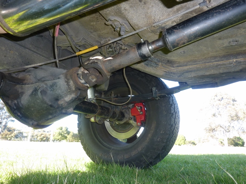 Ford Territory rear disc brake conversion with 13" rotors. OME/ARB rear leaf springs were recently added. CS034RA/OMECJ1A on the right and CS034RB/OMECJ1B left. Same spring rate but the right has more camber to carry the weight of the spare. Driveshaft was made in the USA and has a double cardan upper joint, CV, along with a SYE, slip yoke eliminator conversion. USA made front shaft as well with double cardan joint. Braided and fully ADR approved brake line is longer to match increased travel over stock.
