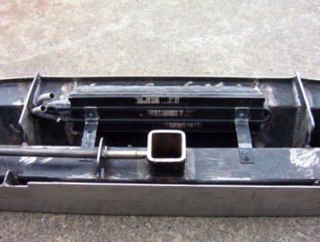 I decided that the bottom vent would be perfect for using a cooler behind it. A stock Cherokee transmission cooler fitted perfectly and will be used as a power steering cooler. I didn't set out to fit this in particular but it just worked out that way in the end. Couldn't find anything else to fit as well. You can see here how well protected it will be. I will still add though some expended mesh in front of it to protect it against stones.