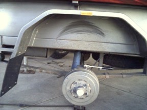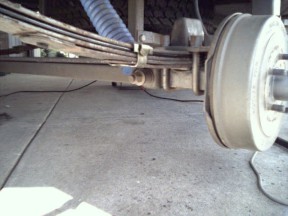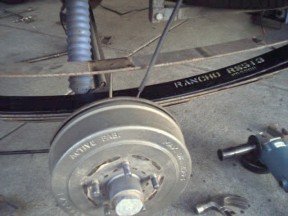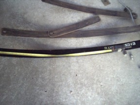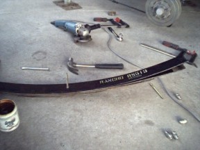 You can now remove all but the main leaf and give them a good clean and a light smear of grease to keep them quiet and they will slide better. Measure the leaves putting the longer end to the rear and replace if worn the friction pads at the end of the leaves. Check the new centre bolt head that it is not too thick and bottoms on the axle in the middle of the spring perch with some of the head still exposed. I cut the head to half it's thickness otherwise when you replace the springs you wont be able to sit the leaves on the spring perch because it will be resting on the bolt head. Then by starting with the shortest, put in the centre bolt and add the next longest until you add the new add-a leaf last of all. Make sure that the hole in this leaf is the same size and if it is bigger, add a sleeve which can be cut from some tube. There is usually a bit more curve in one more than the other so add the one with more curve to the side that was lower when you measured earlier.