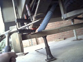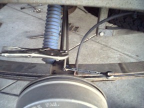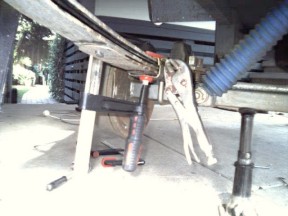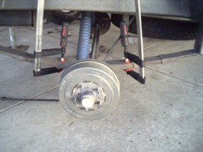 Measure the left and right side and write them down so you can compare after it is finished. Start by jacking up the car once you have chocked the front wheels and place stands under the towbar if fitted or under the frame as shown. Next place a couple of bottle jacks under the axle without using blocks if possible so you can then lower the axle as low as possible when the wheels are removed. Remove the wheels and then the 'U' bolts and lower the axle making sure that all the tension is out of the springs and you have enough room to put vice-grips on the centre bolt head under the spring. You may have to remove the shocks from the axle stud if they prevent you from doing this.