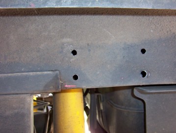 You have align the top bracket so that it is vertically above the bottom one which is pretty well fixed where it can go. I found that hard against the end of the bumpstop bracket was best. I then marked the screw holes after sitting the bracket level with the bottom of the frame. This worked out to be the best place for this particular XJ which had a Rancho add-a-leaf and OME shocks and Up-Country bumpstops. It is VERY important that you test to make sure when the suspension is at full down travel that it is within the allowed maximum length of the bag ( 10.5" ). If the bag runs out of travel before the suspension does, you will rip the bracket from the frame! Also you must make sure that you have enough bumpstop length to prevent over compressing the bag also ( 2.2" ). With mine, due to the higher lift, I turned the top bracket upside down and extended the bumpstops to work in with the travel of the bag. Before drilling the hole check to make sure you don't go through fuel lines or wires. The left side also has the shock cross member in the way so three of the holes are drilled at only 5/16" for the use of 3/8" self taping bolts to be used. The bottom rear on the left side, you can see above, is drilled 3/8" as is all the bolts holes on the right hand side bracket and also drilled right trough the frame so long bolts can be used with nuts and washers.