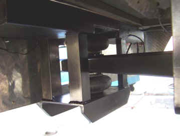 You can see above the platform which supports the two single tear airbags from Firestone. They offer about 2" of travel between them which has been more than enough to remove the transfer of vibration to the trailer or even vice a versa. I also ran a line from the compressor tank to the back next to the fill valves for the bags so it is simple to adjust the bags for different loads. It is adjusted to be perfectly level each time. He has found that only half the pressure is needed in the top bag which controls the upward movement.
