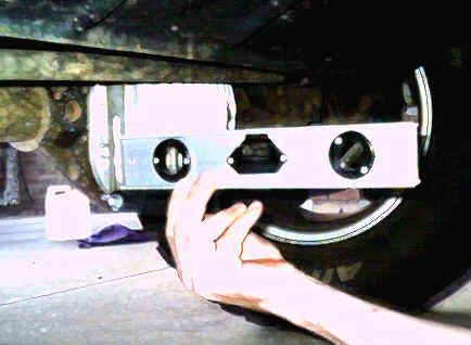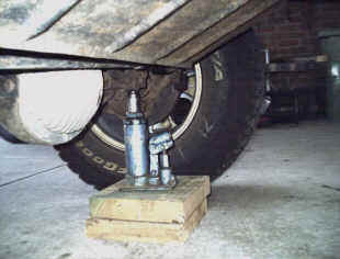 You can do one side at a time after and the best way to get the spacers in is to put the jack under the coil mount on one side and the trackbar at the other ( don't forget that I have a RHD ) once the bolts shown above have been loosened on both sides. The main bolt is in a slotted hole and will move forward as you jack the front as shown. You will find that there are two 'U' shapes inside each other with the inside one moving forwards as the main bolt slides in it's slot. You then add the packers between the two. It is then just a matter of adding packers of different thickness until you have the 87.5* back after releasing the jack. Then tighten everything back down starting with the 1/2 nuts first before the main bolt. Do a final check of the angle to make sure it hasn't changed with the tightening. I found that with mine and a few others after a 3" lift that 3mm or 1/8" packer was required.