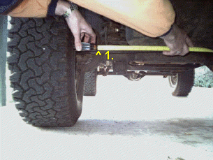 Measure between the front tyres on the widest part both front and rear. I hold the tape level with the bash plate on the front and against the underside of the lower control arms at the back. Make sure you stay off the raised lettering on both tyres. Just hold the back of the tape case against the tyre and read it from there, ( No 1 ) without adding the width of the tape case as it doesn't matter so long as you do the same thing at both ends. If you have a difference then you will have to adjust the length of the tie rod by first loosening the two clamps ( 1/2" ) on it.