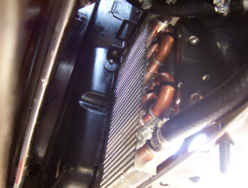 With the other side I angled in the bracket as much as possible to flow more air across the cooler. I have left the stock cooler in place and now has power steering fluid running through it via 3/8" hose diverted from my filter in the return line which you can see here. The holes for the zip ties where drilled left and right of the tube elbows and has the same rubber strip added so there is no metal on metal contact. You can also see in the next picture the small section I had to block off in the corner to prevent air being sucked freely though there without passing through the cooler.