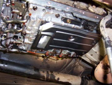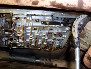 Check in the drain pan and make sure that you haven't knocked off one of the retaining clips for the solenoid plugs like I did once and didn't notice until it was all back together so the oil and pan had to be dropped again to fit it back on. Fit the pan back in place with the cork gasket dry and without sealant and put the bolts in a cross hatch pattern before going back over them until the cork just distorts ( avoiding over tightening them ). Clean the 'O' ring and lightly grease the joint before putting it back in and replacing the bolt. Fill the transmission with Dexron III transmission fluid down the dipstick tube using a funnel and you will need about 4 litres. Start the car and run through all the gears before leaving it in neutral and still running and checking the cold level on the back of the dip stick. This is not very accurate and it should be driven 25 kms ( 15 miles ) to bring it up the full operating temperature and then run back through all the gears and checked again with the car still running and stick wiped and reinserted before checking the correct level on the hot side. It only takes 0.5L to go from ADD to FULL on the stick. It is also a good idea to adjust the throttle cable by pushing the button under my right thumb and pushing the part where the cable comes out all the way in before pushing the throttle all the way to the floor and it's done.