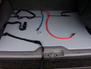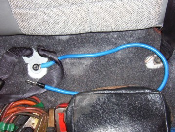 For the earth connection I used a seat belt anchor with a star washer to make sure there was a good connection. When the battery is not in place the cables are left under the seat. You must however cover the end of the positive cable or disconnect it from the isolator as it will be live once the main battery is fully charged while the car is running. It is not live at any other time.