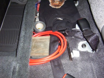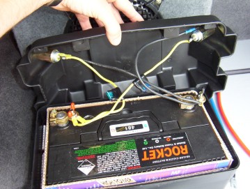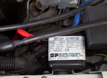 The separator I used, to stop the main one from being drained while to engine is not running, is sold through ARB outlets here in Australia but being made in the USA it should be easy to get them there. It is made by Sure Power and you can see the details of it here http://www.surepower.com/Products/batsep.asp . Be aware there was a recall on some of these. It will also charge the auxiliary battery once the main one has reached above 13 volts making sure this way that the starting battery is always fully charged first. I placed it just behind the fuse box. A new 2 gauge cable was added ( no need to change the existing wiring at all ) between the standard battery and the separator. I also added another ground to the body as I chose to use the body as the ground supply for the negative terminal for the auxiliary battery and the stock battery to ground cable is not good enough. Then I used 2 gauge cable to run the positive all the way to the back of the car. The reason it is so thick is because of the distance it has to run as well as another feature of this separator. At start up it checks the voltage of both batteries and if the starting one is lower than the auxiliary it will couple both together to help start the car. If you don't want this feature you can just use 6 gauge wire and leave off adding one of the other wires explained later. The cheapest place to buy 2 gauge wire is from a welding supplier.