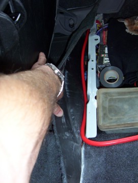 I cut some 6 ply board that I found and made it about 40 mm longer so it tucks under the rear seat keeping that end clamped down when the seat is in the upright position. The hold down strap passes through a slot cut into the board and under the board and back up through another slot on the other side of the battery. This is a far strong way than around brackets mounted into the board and the surface area is much higher than of a few screws! The board is covered it all in grey vinyl to make it easier to keep clean. The positive cable was run through the firewall in a grommet and under the lower door trim. It then runs between the carpet and the seat panel but made sure that I bent the end of that panel where the cable turns and runs under the seat as shown above.