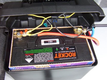 I bought a battery box from the local auto store and you can get them from boating places etc as well. They come in different sizes so first pick your battery! The battery you chose must be fully sealed!! This does not mean you have to use a dry cell or gel battery, but you can still use a lead acid one like mine so long as it a fully sealed maintenance free one ( not all maintenance free are fully sealed! ). It cannot vent at all as the gasses are dangerous and can ignite in a closed area. I bought a Yuasa Rocket ( SMF NX120-7L ) battery. It has a 730 CCA ( cold cranking amps )( 730 amps can be discharged at 0 degrees F (-17.8*C) for 30 seconds while maintaining the voltage above 7.2 volts ) with RC 160 ( reserve capacity )( can handle a 25 amp draw for 160 minutes before reaching 10.5 volts at 80*F ( 26.7*C ) and 90 AH ( amp hours )( Yuasa states this means it can handle a 9 amp drain for 10 hours before reaching 10.5 volts ( some companies rate it differently, see here ). I chose this one as it a bit of a hybrid battery as it in-between an all out starting battery or a deep cycle one ( sometimes called a dual marine ). So it can happy serve both functions.