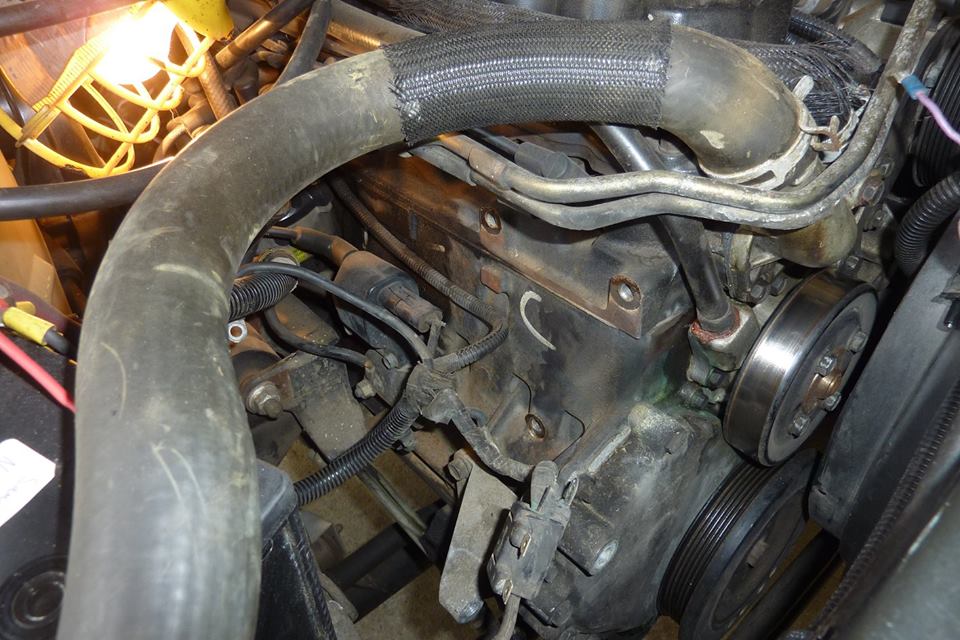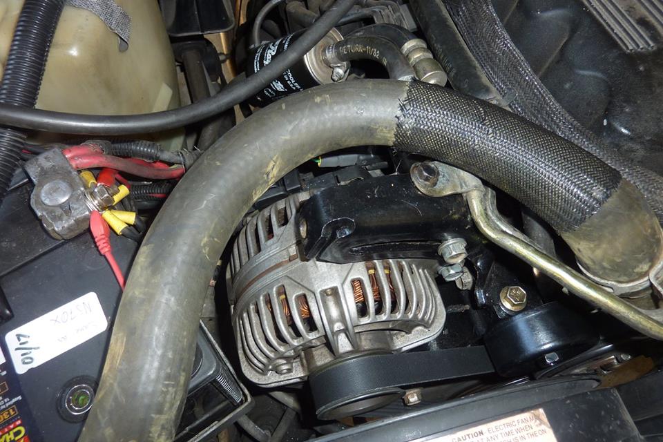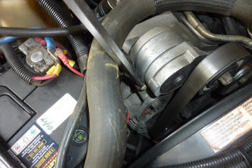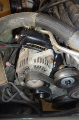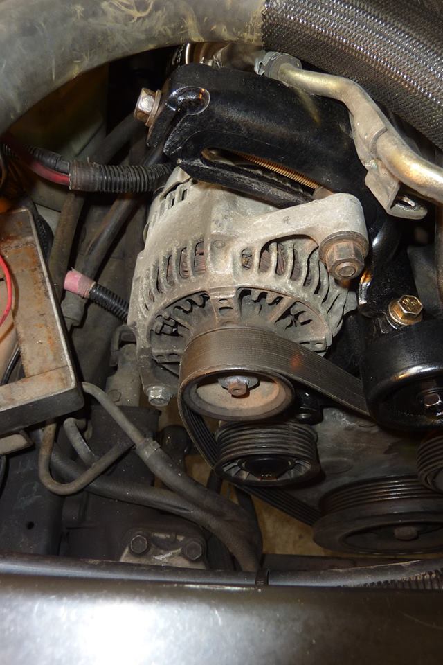 If stock you can just run the belt the same as the 96 model. The problem you face, if running two electric fans having removed the old fan hub, is that it interferes with one of the timing bolts seen below the alternator above. Running a longer 6PK2305 belt will mover it out of the way.