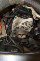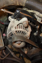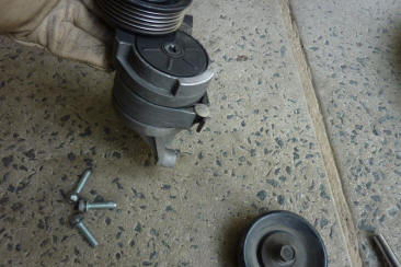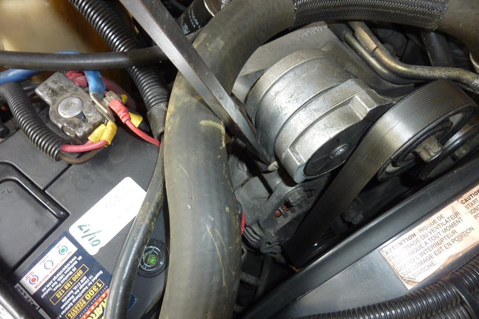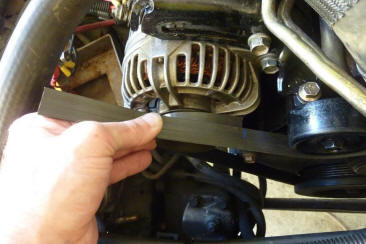 As I was fitting a physically bigger 132 amp alternator, instead of the 90 amp stock one, it pushed the pulley across far enough to clear the bolt anyway. To workout what belt length I needed, I just cut the longer old one and pulled it tight and marked the overlap. Then just measure how long it is. Part number will be 6PK, (6 ribs), follow by the length in millimetres. In this case I measured 2310mm but they had none in stock so manage to squeeze on a 2305mm one. 6PK2305.