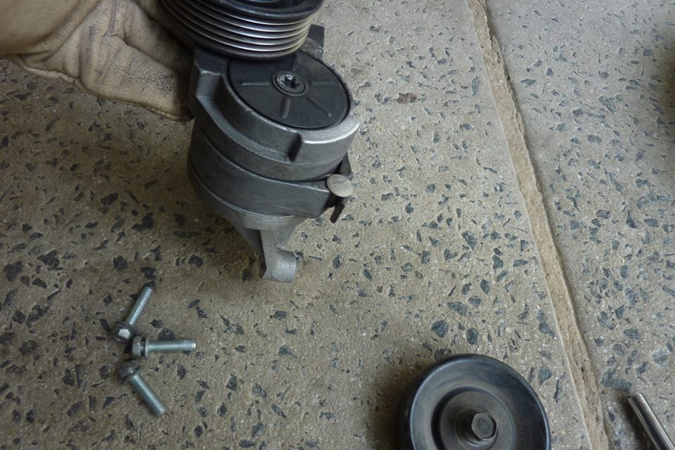 My auto belt tensioner was getting a little slack and causing belt squeal. A temporary fix was to jam a 3/16 screw in behind the spring end. Can see the screw here adding more tension by forcing back the end of the spring away from the old stop in the opening.