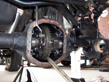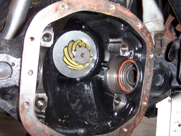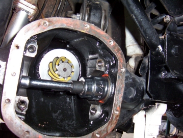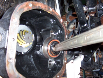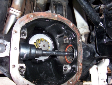 The photo shows the new seal in place. The other side can now be done passing the extension through the newly installed seal taking care not to damage it. Place the socket and seal on the end of it after it is through and repeat the process. Re-install the diff center using a large rubber or nylon mallet to tap it into place and replace the bearing caps. Make sure you have them on the right side and way up. Torque them to 61 Nm or 45 Ft. lbs. Replace axles and then the cover using Loctite Grey or similar and refill diff with SAE 75W-90 API-GL5 grade. Hub bolts to be torqued to 102 Nm or 75 ft. lbs.