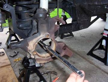 Start by removing the wheels, calipers and rotors like I show in my hub replacement write up. What will save some effort, and buying of a socket if you don't have one, is that there is no need to remove the hub from the axle. Just simply leave the the large centre nut in place and remove the hubs along with the axles after removing the three bolts on the back of the knuckle that holds the hub in place. Drain the oil by removing the diff cover. Next remove the two bolts each that hold the bearing caps in place. Take close notice which side they came from and which way up the caps are. You should find a letter stamped in both the cap and the housing next to it matching each other and the way they face. See photo above where you see the letter F on the cap and just above the cover bolt at the same height. The other cap had the letter F too but was the letter was on its side. To remove the diff, put a ring spanner on one of the crown wheel bolts to stop the carrier rotating as shown. Then place a pry bar or tyre lever under the diff into one of the recesses and just lever it out. No need for a diff spreader.