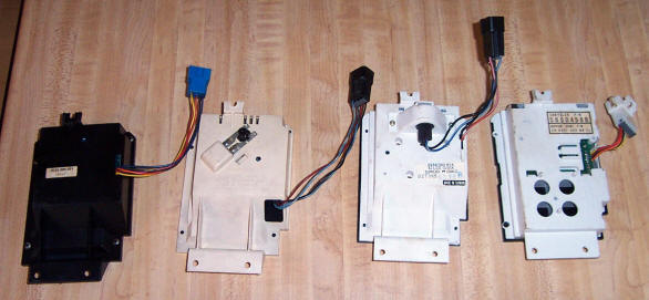 The '90 version back lit clock is similar in casing to the '91 casing in material, but uses a back lighting by way of a No.74 bulb, just as the '89 clock, and is green in illumination colour. This is due to a green 'filter' they put between the light and the clock image on the LCD. The drawback though is that with this model, they place another piece sticking out the back of the module, pulling the light away from the clock face, which I've personally found in daylight impossible to read, unless shadows by ones' hand. The wiring is similar to the '89 model, but wires are solid colours [except for the red] , and much thicker than the thin telephone like wires that the previous one uses. As well, this is the only model that isn't sealed, and can be taken apart quite easily once the back screws have been removed. I however didn't do this, as using a similar clock as the '89, once the clock is opened up, the rubber that sits between the clock and the clock LCD face breaks off far to easily. There is also two different wiring methods I've seen used with this clock, one being just the plain 4-wire connection, and the other having a full harness but not being utilized, which I call version A, and the former one version B. Depending what clock one wants to switch out to if they so desire, will depend how easy or hard to do upon which harness is installed. The two harness versions are as follows: