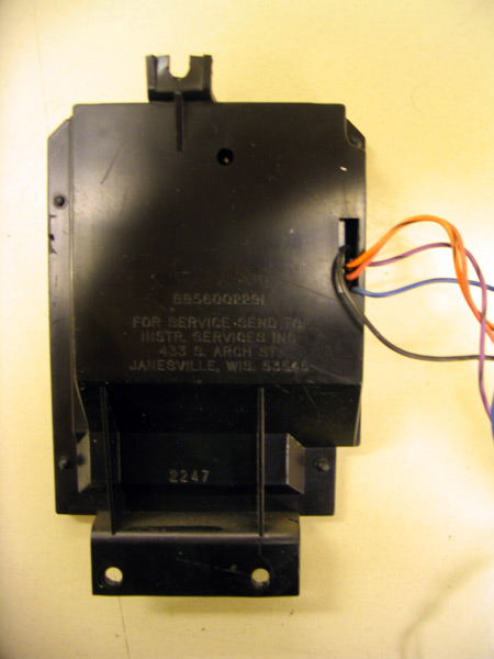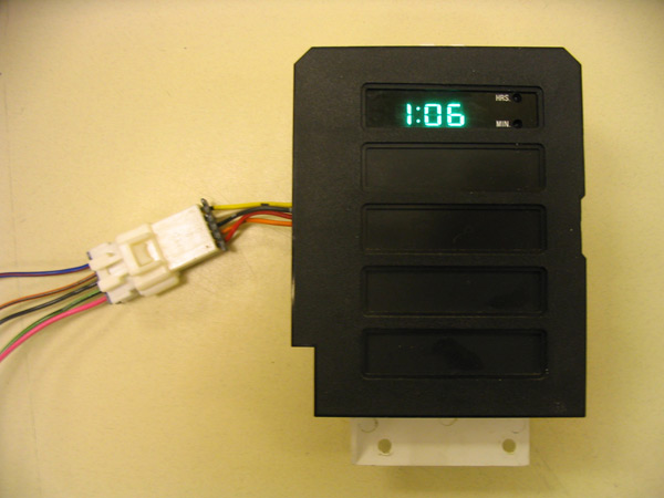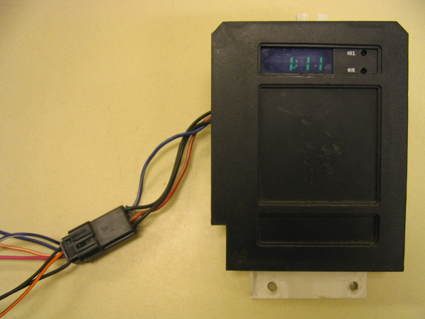 The front bezel matches that of the idiot light panel on the right side of the steering wheel. There appears to be 4 holes that are left for future considerations for lights and info panels, but unsure. Could easily be modified and used for other uses as well, such as an alarm LED, or other such things ( see further down ). The colour of the clock is green, but when done without the front panel on, it's actually the more common blue cast, and is closer to the colour of the overhead console. This is due to the plastic front insert being green, where as the overhead console is a smoke grey. To match an overhead console, this could be easily accomplished by replacing the plate with the same smoke grey plate, that seems to be used in the '88 models. I'm planning on doing this since I have several clocks at my disposal at present. As far as I can tell on the wiring, and from the experience of putting in a '91 overhead console into a '90 Pioneer, the colours following that install would be as follows:
