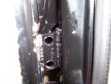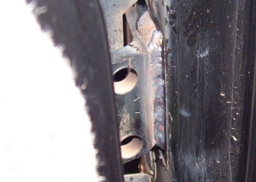 Now you can see the effected area has been ground away and the putty removed. Also take a close look and you will see that the panel is cut away from the thicker A pillar itself from the the factory. You must only weld on the A pillar. On the right you can see my weld vertically and on the top not touching the panel at all. You have effectively doubled the welded area and more importantly it is all in the front where the load is. I was able to do this repair without removing the door or front guard. If the hinge had torn further this may not be possible. You would have to remove the front panel to first get the hinge back where it was before welding if it has pulled itself away.