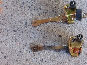 The check strap is removed by knocking out the roll pin from below which I did by hammering up under a screw driver. Then remove the 2 nuts from the door side and then take off the door trim. Once that is off you need to take out the speaker so you can get your hand up there to pull out the check strap and replace it with the new one. Those in the USA that have this problem or worse and don't have access to a welder, there is a kit available to fix the problem as well. See this PDF file for the information on it.