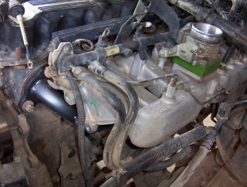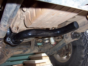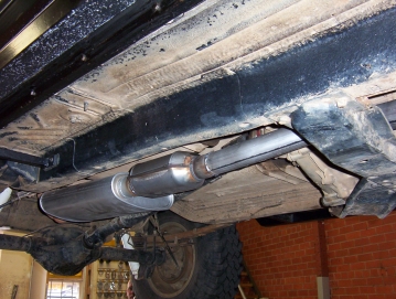 Reconnect all lines and cables etc and the pump and belt and so on. Also re-adjust the kick down or TV cable as covered here. I had cut away the exhaust system until the front of the muffler so I could fit the supplied S tube. I then drove to the local exhaust place here ( Exhaust Fix ) and had then fit a fully stainless steel cat ( not ceramic brick inside to crumble ) with a new muffler. Magnaflow make a really nice at stainless cat and muffler now a days. The original tail pipe was reused as was stainless steel and in good condition apart from some baked on mud which can be wire brushed off. The engine gives much better response down low and all through the rev band with a now lower tone without any drone.