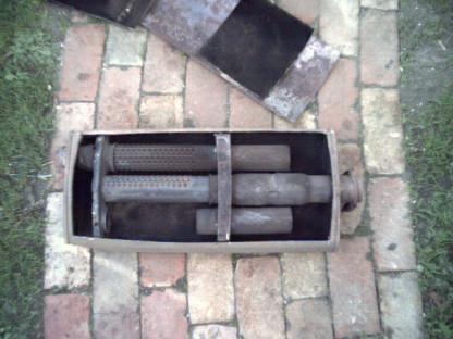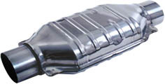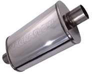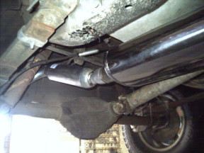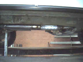 While the exhaust is hot it is of greater volume so a 2 1/2" Car Sound catalytic ( part number 94006 ) converter was used ( Magnaflow make a better all stainless steel one now ) along with a stainless steel Magnaflow muffler which is un-baffled ( check out the stock one at the bottom of this page ) meaning you can look straight through it. Looking at their site I have the 5"x8" oval body 18" long ( with the tape it was 16"? ) 2 1/2" offset muffler ( part number 14256 ). These give a nice deep mellow sound outside and very quite inside the car. A bigger one would be even better and would remove the need for a resonator to be fitted as well.