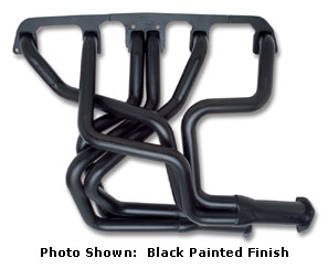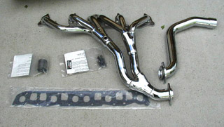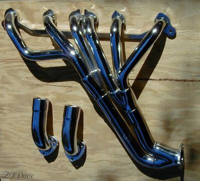 This view from the backside of the both headers shows just how much longer the new headers are before ending in a 2 1/2" pipe compared to the 2" stock one. They curve down under the bell housing before coming one rather than the side of the block on the stock header. The Pacesetter header on the far right above but are made from steel and quite a good design. Try also Headman headers and Clifford headers and look at theirs.