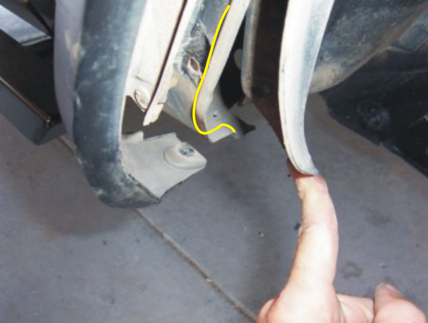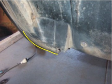 You will find that it will rub on the bottom edge of the flare as well as the inner guard. I cut off the vertical lip of the flare along the yellow line shown. I only loosen off the bottom half of the flares to do this job. It can be hard to remove the flare as some of the studs have a assembly clip on them. They are either forced off or cut with side cutters.