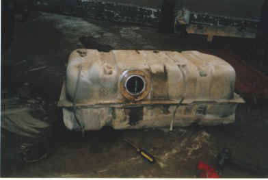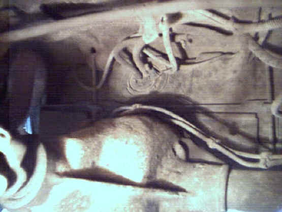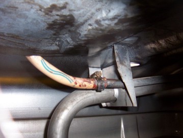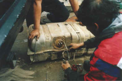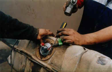 Above shows that the tank sender is easily accessible above the rear diff. It has the two hoses going into it with one going to the engine and the other being the fuel return. You will also find the wires for the sender attached. The following photos were kindly provided by Jorge Risco in Lima South America who found it easier to remove the tank to do it.
