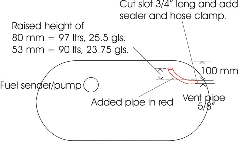I have modified the stock fuel tank to increase the capacity by raising the vent tube inside the tank. You can get at by removing the fuel pump with the tank still in place. Just make sure that you don't have more than a 1/3 of a tank. I added a 90* bend made in aluminium (was a old ski stock that I bent up) and cut a 3/4" long slot in it so I could push it over the end of the vent pipe ( 5/8"dia. ) with some sealer and a stainless steel hose clamp. But Doug Leblanc emailed me to say that he found that using the flared end of a auto dip stick tube works perfectly. This raised the vent to about 1/2" short of the top of the tank ( 80mm higher than stock ). When I filled the tank it first stopped at the old level but since then it has filled right to the top. I got a total of 97 litres ( 25.5 us. gallons ) in the tank which is 21 litres or 5.5 gallons extra. I have removed the unleaded flap to improve the speed of the fill and so you can see what is happening. I was always able to get this extra in if I dribbled it in, but it took an extra 15 minutes. So now it is a lot quicker and you can carry one Jerry can less on the long trips. If you are worried about the fuel expansion, it would only make a difference if you filled on a cold night or morning and then without driving far you left it in the hot sun. It will then slowly dribble out past the cap until you drove it again or it cooled. It has happened a couple of times to me in the last 5 years during summer as we get 100 degree days here and I had only driven a mile from the service station the night before a hot day. If you know you are about to that, then just stop early. Otherwise it maybe better to only raise it 40mm and get half the increase. You only have to drive a 100kms or 60 miles to use the extra fuel to bring it back to stock. I have always put the extra in on long trips and have been in above 40*C ( 100*F ) temperatures for the last 5 years with no problems. Someone on the Cherokee list from South Africa has the same mod without any problems as well ( he was able to bend the stock pipe up ). I have since found that by raising it 53 mm that it has stopped the fuel leaking out when left full in the hot sun so long as the cap was done up tight and the seal is in good condition. This gave a capacity of 90 litres or 23 3/4 gallons.