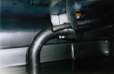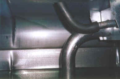 Now this it what it looks like inside the tank which Jorge managed to take and was the first time I had seen it myself! You will find the vent tube next to the large filler tube which goes to the petrol cap. It is a tight squeeze getting your hand into the tank and around the the left side of the tank ( the right side when facing backwards like the photo ) but it can be done as I have large hands and and to squeeze it with the other one to fit it in! You should just be able to reach the end of the vent line over near the side of the tank as it only comes in a few inches. Jorge here in the photo has fitted a rubber tube instead of a metal one like I recommend ( see below ) as had tried the same thing using a heater hose that was formed in a 90* bend like shown but lost it's tension after a short time and sagged. I then had to pull it out as no longer could get the extra fuel in but I hope he has more luck and there might be a difference in type of rubber etc used!