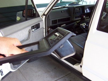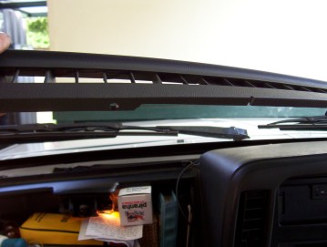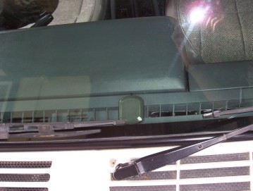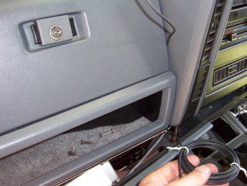 The aerial lead was run in between the dash joint as shown. Then along the edge of the glove box out of view. The trim along the windshield was removed and a small groove filed into it where I wanted it to come out which you can see in the right photo.