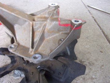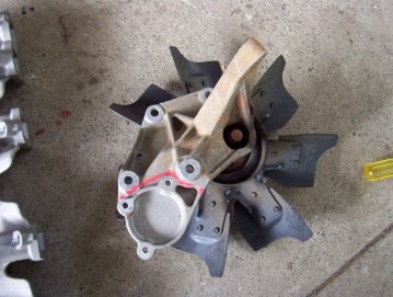 So I had to remove the pump part shown in red from the fan mount ( RHD models only ) so that it would not interfere with the pump bolting to the intake instead. I left as much as possible of the original fan mount to give it strength. When I compared it to a Wrangler set up with the late model intake this looked stronger than the stock setup. I still left part of the upper bolt boss in place for additional stiffness even though you can not use it. You must however remove some off the back of it as it hits the intake otherwise as shown in the right picture. I have since removed more as I since fitted an electric 16" fan ( must pull around 2000 cubic feet ) into the original shroud.