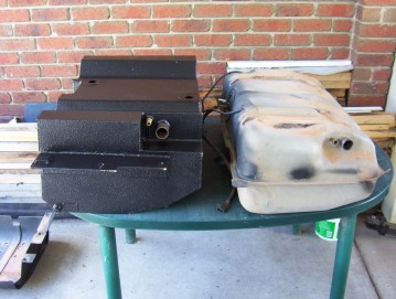 The new tank came in a hammer tone finish but I went over it with a rubber and tar based product called Grip 51 which I applied using a medium textured roller. I used this under the whole Jeep and trailer also as is very good at protecting against stone damage. You can see in the side by side shot that the extra volume is mainly in the squarer corners and that it takes in the width of the seamed area of the old tank too. It is just over a 1" deeper but is sloped up to not reduce the departure angle.