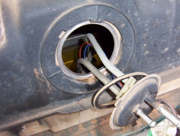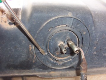 The pump/sender is placed the same angle and distance from the bottom of the tank as the stock one. What this means is that you sit on full for quite a long time before the gauge starts to fall. At least empty still means that which is the most important. I marked what was straight up on the face as it is easy to tilt it otherwise. The new tank has the unit held in place with a large screw in ring which is turned using a punch and hammer. You do have to trim off a couple of locating tabs to be able to fit it over the pump/sender unit. Make sure you fit the old rubber O ring dead centre first and hold it in place with some drops of super glue to stop it moving while installing the unit. Better still is to tilt the tank up until the sender part is flat so the O ring wont move when fitting it. Now place the filler and breather hoses on the new tank taking careful note on how they sat on the old tank. Same as above in case you forget.