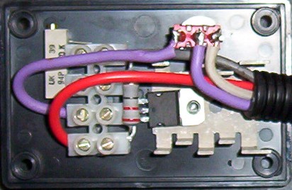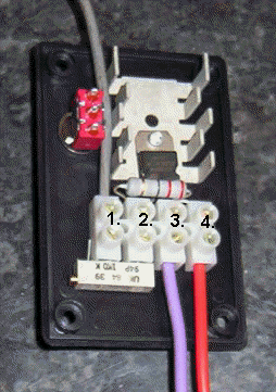 Time to add it to the box you wish to keep it in. I just used a small one sold at the electronic store. I used a rivet from the other side to hold the heat sink to the regulator and keeps the hold thing in place too. You will see also in the next shot the toggle switch has also been put in place. The grey wire at No.1 goes to earth on the firewall. The purple wire in No.3 runs the modified voltage to the switch. No.4 has the 12v input.