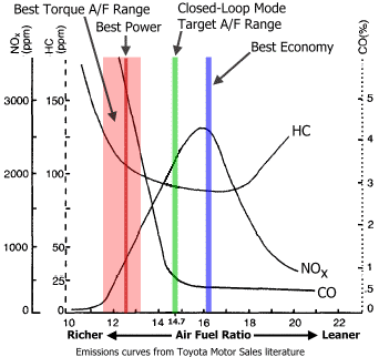 | 14-15 | CHEMICALLY IDEAL: At 14.6 the A/F is at the theoretical ideal ratio with no excess fuel or oxygen after combustion. Good A/F for part throttle cruise and light to moderate acceleration. |