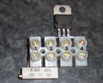 You start with the regulator by bending the two pins outwards and then down so it can be inserted into the terminal strip. I had to extend them by just soldering on some wire cut from the resistor. It is then placed into the terminal block No. 2, 3 & 4. Only No.4 should be screwed down at this point and the other two when the resistor is added.